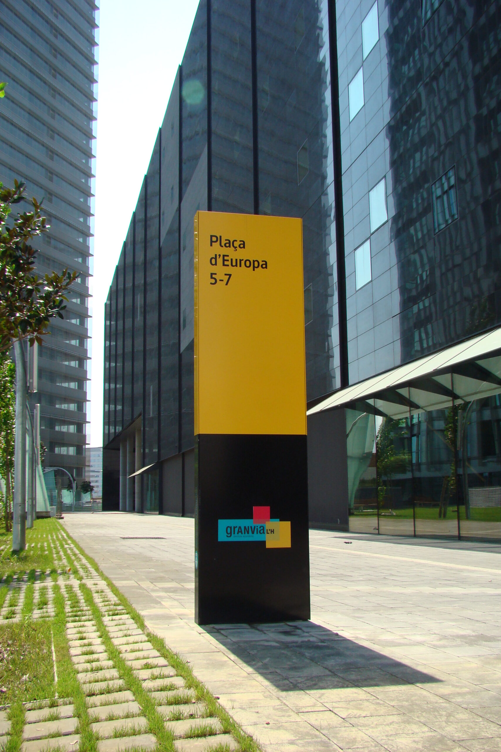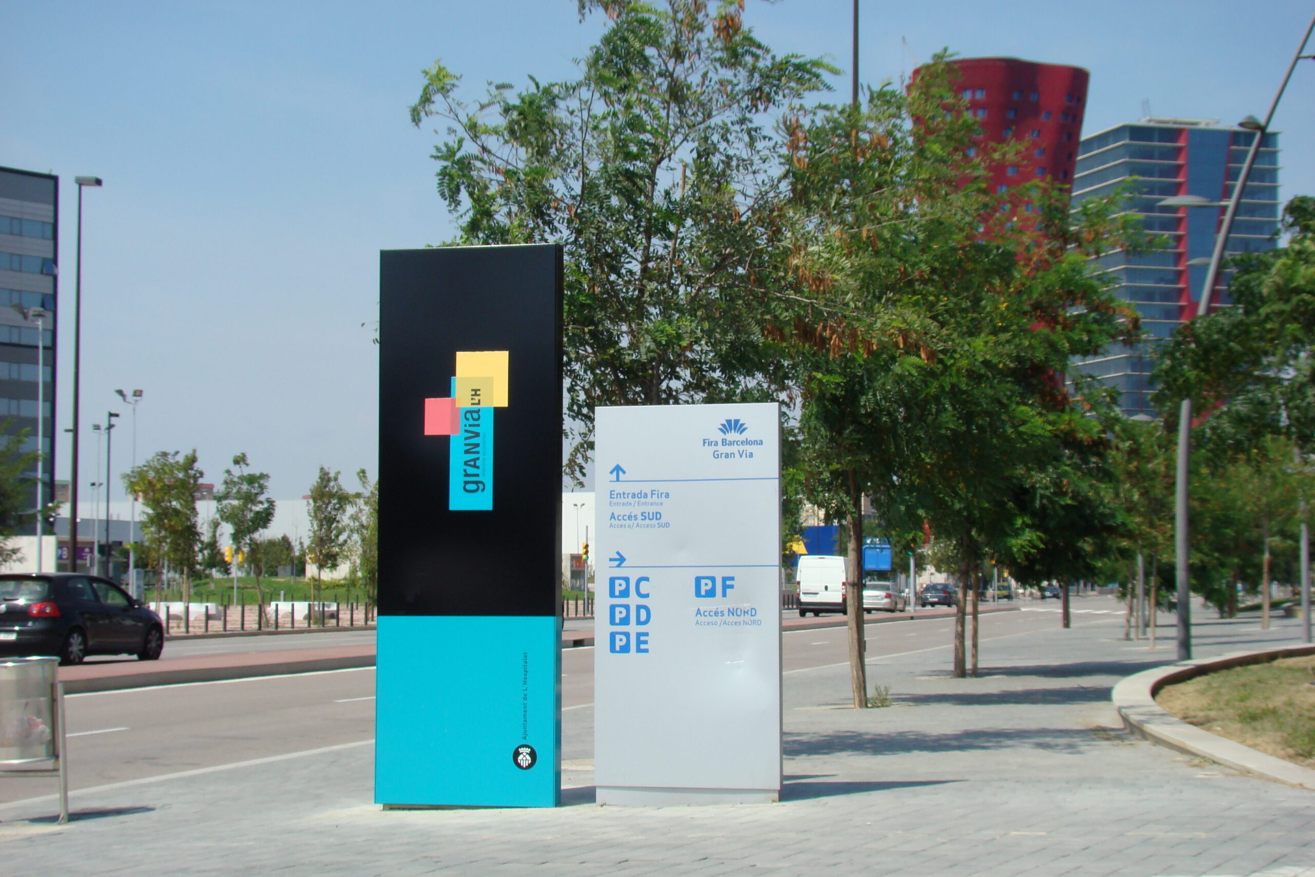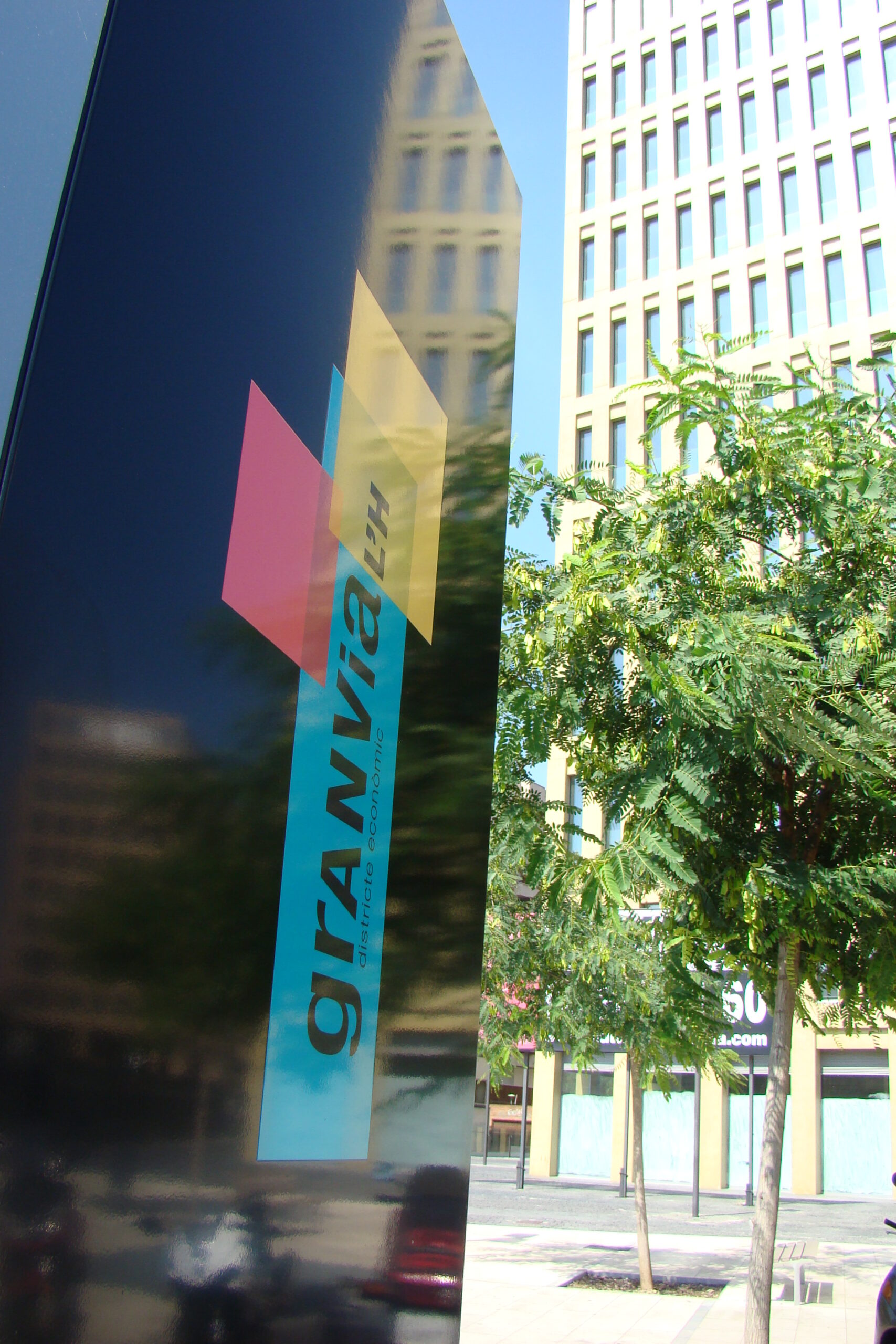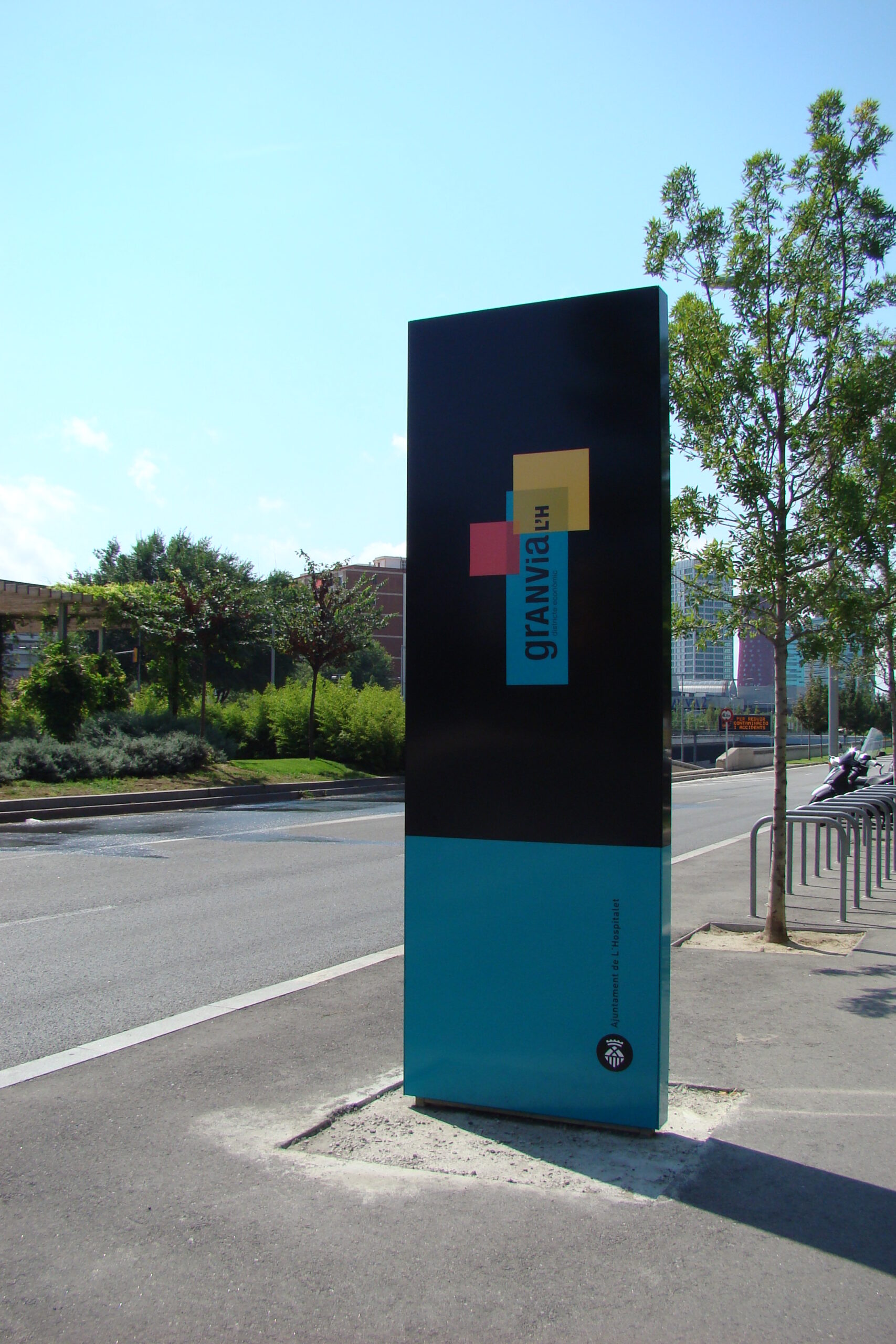 Rebem l’encàrrec de l’Ajuntament per a dissenyar un element de senyalització que cobrís totes aquestes necessitats: Logo Granvía L’H, adreça de l’edifici, carrer i número, logotip de l’Ajuntament, tot això amb un acurat disseny i una solució cromàtica prou atractiva com perquè sobresortís d’aquestes grans moles arquitectòniques i amb l’última premissa que havien d’aguantar, amb una certa dignitat, els actes vandàlics.