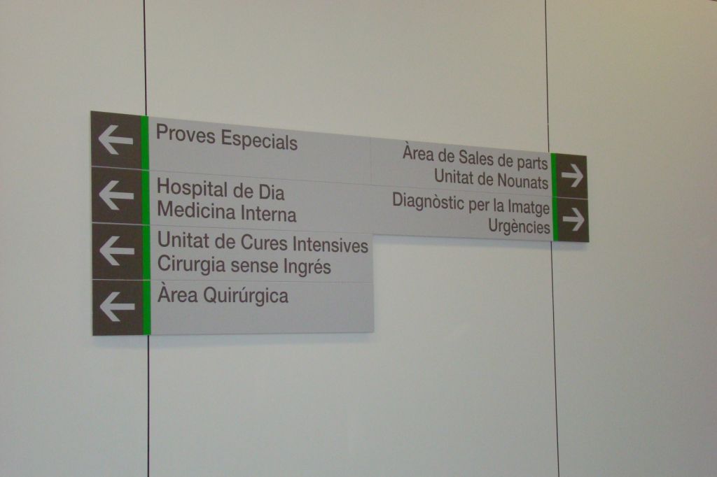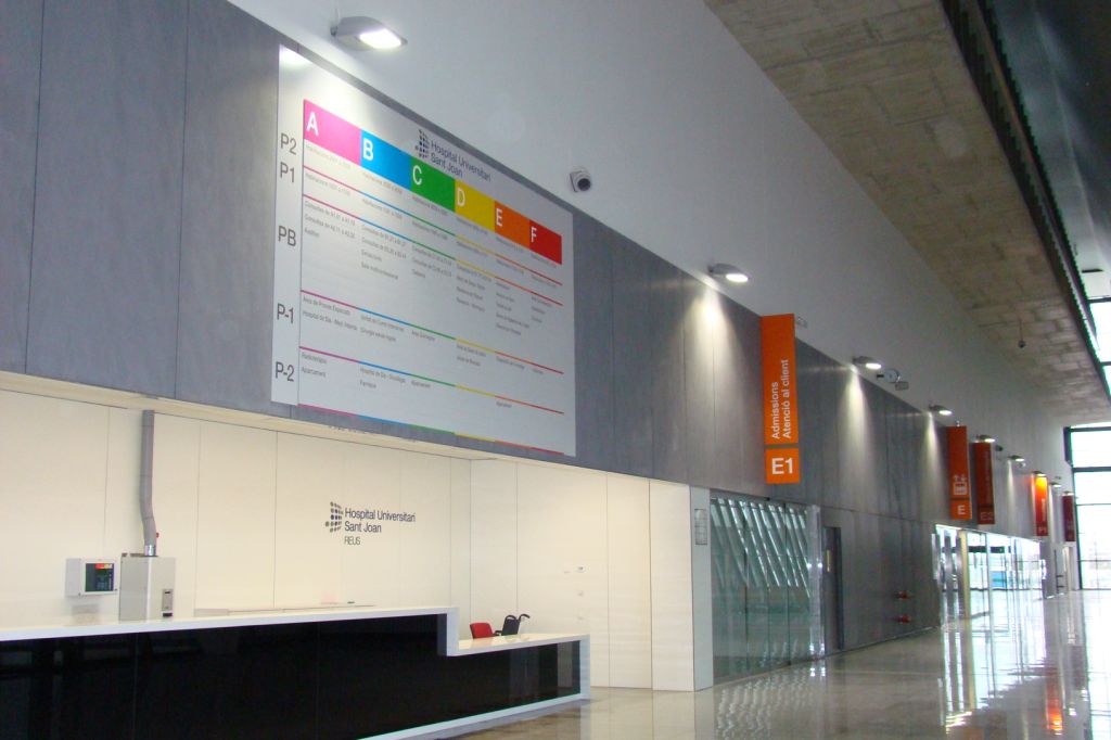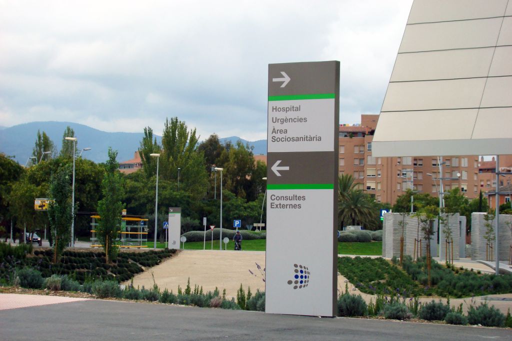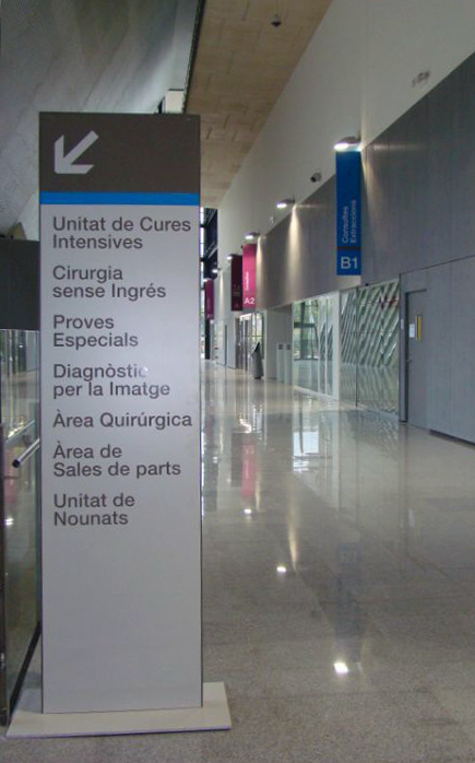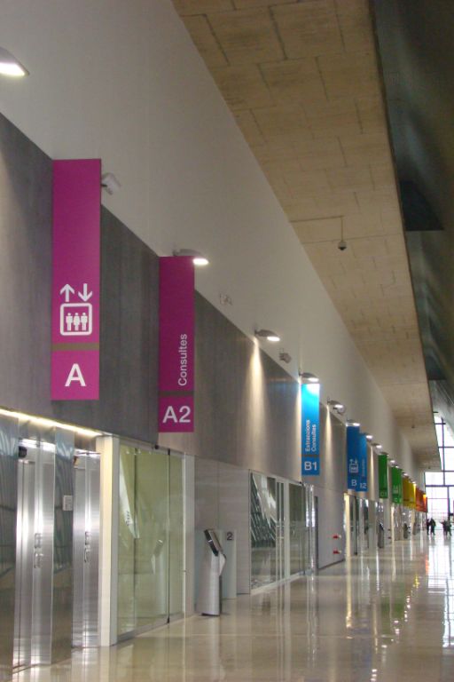 Signes va guanyar el projecte d’estudi de necessitats i disseny de la senyalització de l’hospital. Organitzar la senyalització d’aquesta mola de gairebé 100.000 m² no va ser tasca fàcil. Per a això es van realitzar innombrables visites a l’obra per a entendre la complicada xarxa composta d’accessos, passadissos, plantes, pàrquing i diversos edificis. Tota la informació es recull en un enorme panell que es troba en l’hall principal que com a directori general ordena verticalment la informació amb 6 codis cromàtics. Els nuclis d’ascensors identificats amb grans banderoles perpendiculars –l’espai és enorme– organitzen els accessos d’una forma visible i ordenada. La senyalització es complementa amb un sistema modular versàtil a través de rètols direccionals, posicionals, pictogrames i marcatge de vidrieres.