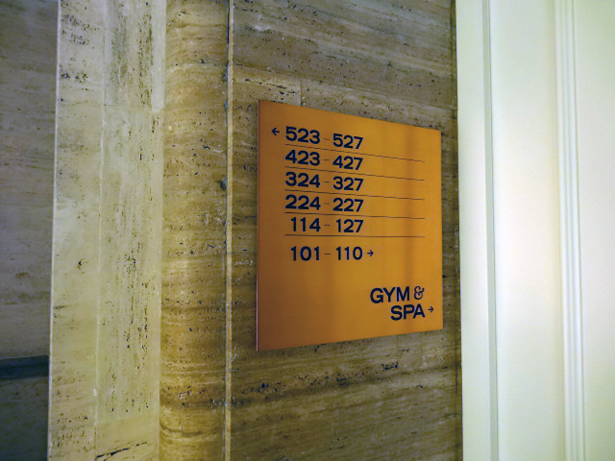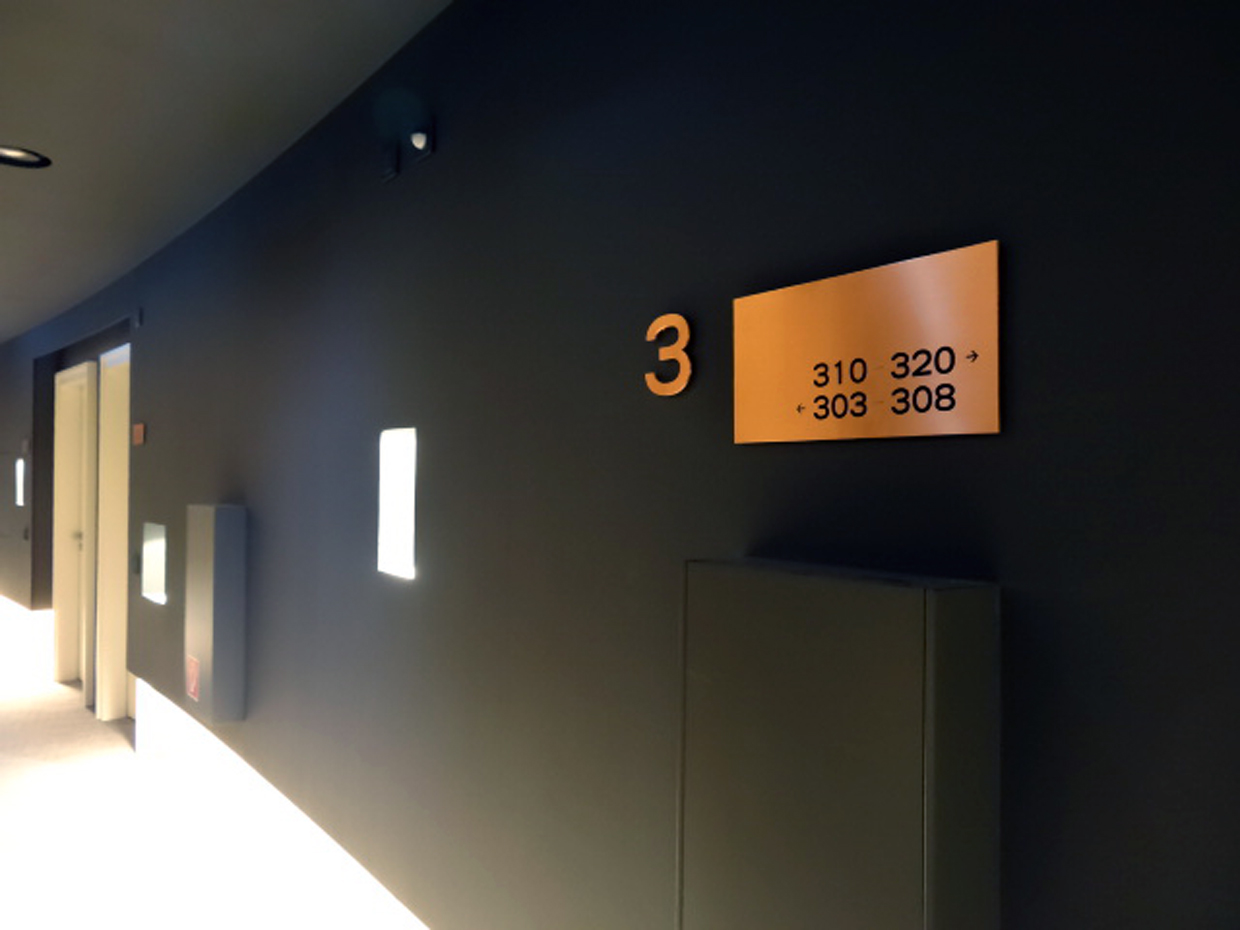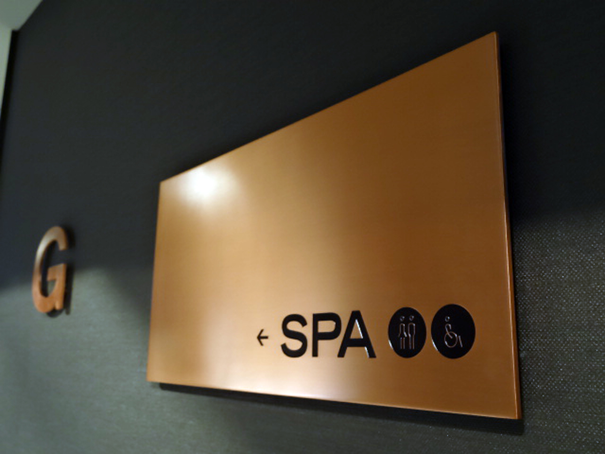 El coure va ser el material proposat com a suport ja que encaixava amb la decoració i formava part de l’interiorisme, la proposta minimalista dissenyada resol les necessitats d’identificació però amb la premissa de veure només la senyalització quan cal. Totes les peces van ser tallades per làser, gravades i acabades amb un bany de vernís semi mat.