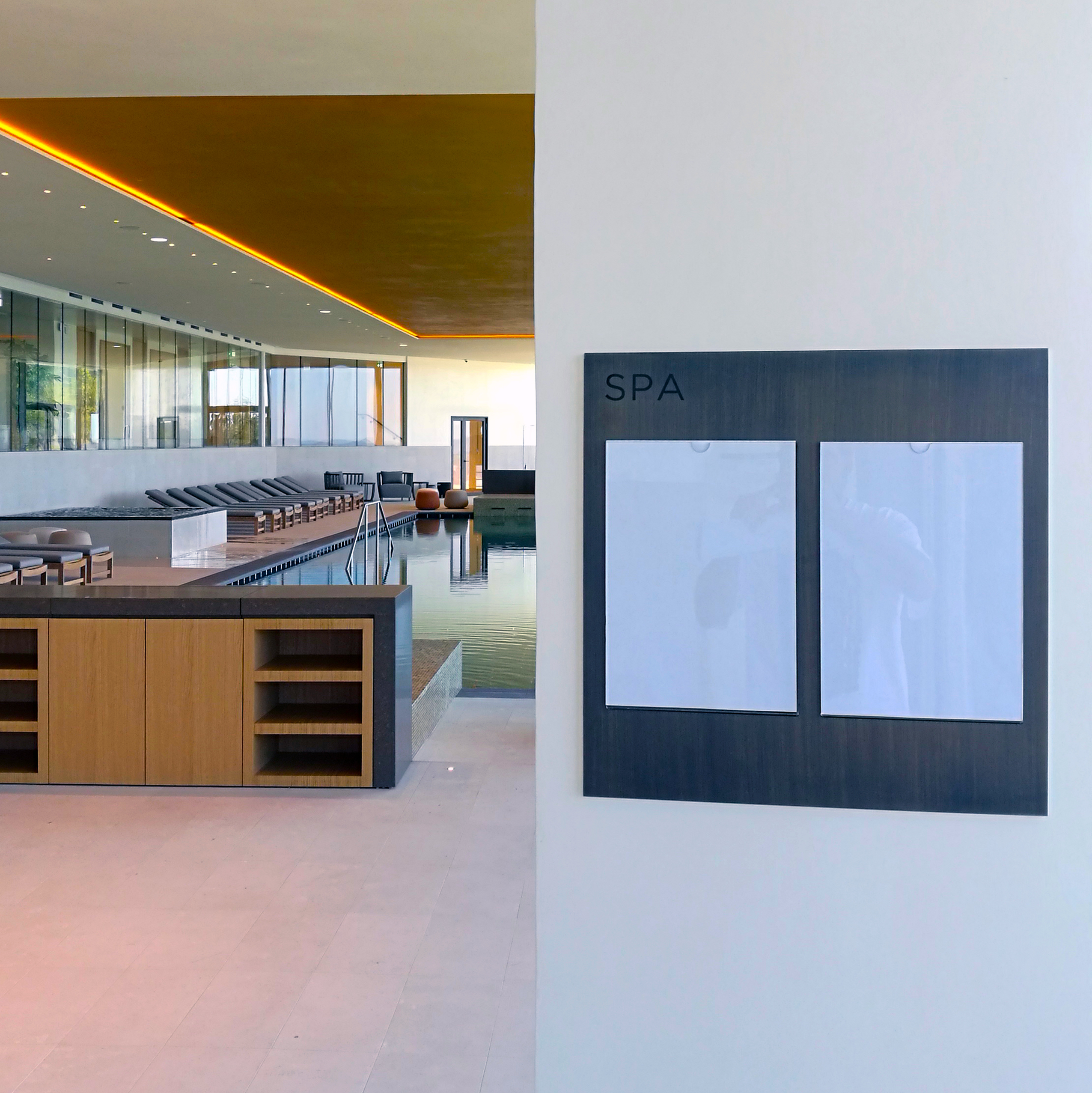 Inspirats pel to daurat del xampany, a l’arquitectura contemporània ia l’entorn tan singular, Signes es va encarregar de dissenyar tots els elements de senyalització (tant interior com exterior). Partint de materials nobles, com el llautó envellit i amb el color daurat com a protagonista, es va projectar una senyalització elegant, de línies simples, però amb molta personalitat, que no només conviu amb amabilitat amb l’arquitectura i el disseny interior, sinó que també és una extensió visual de la marca i transmet els mateixos valors de qualitat.