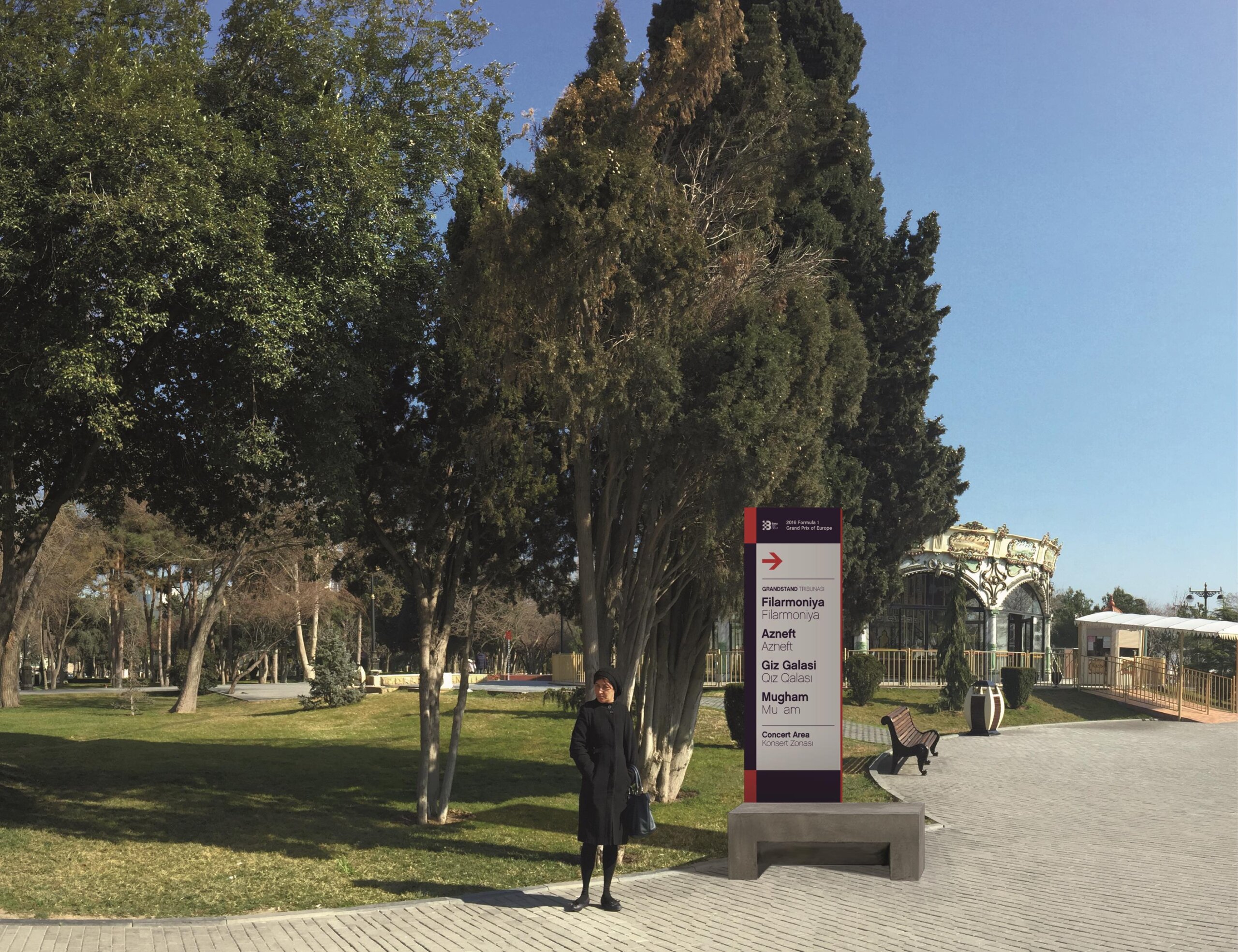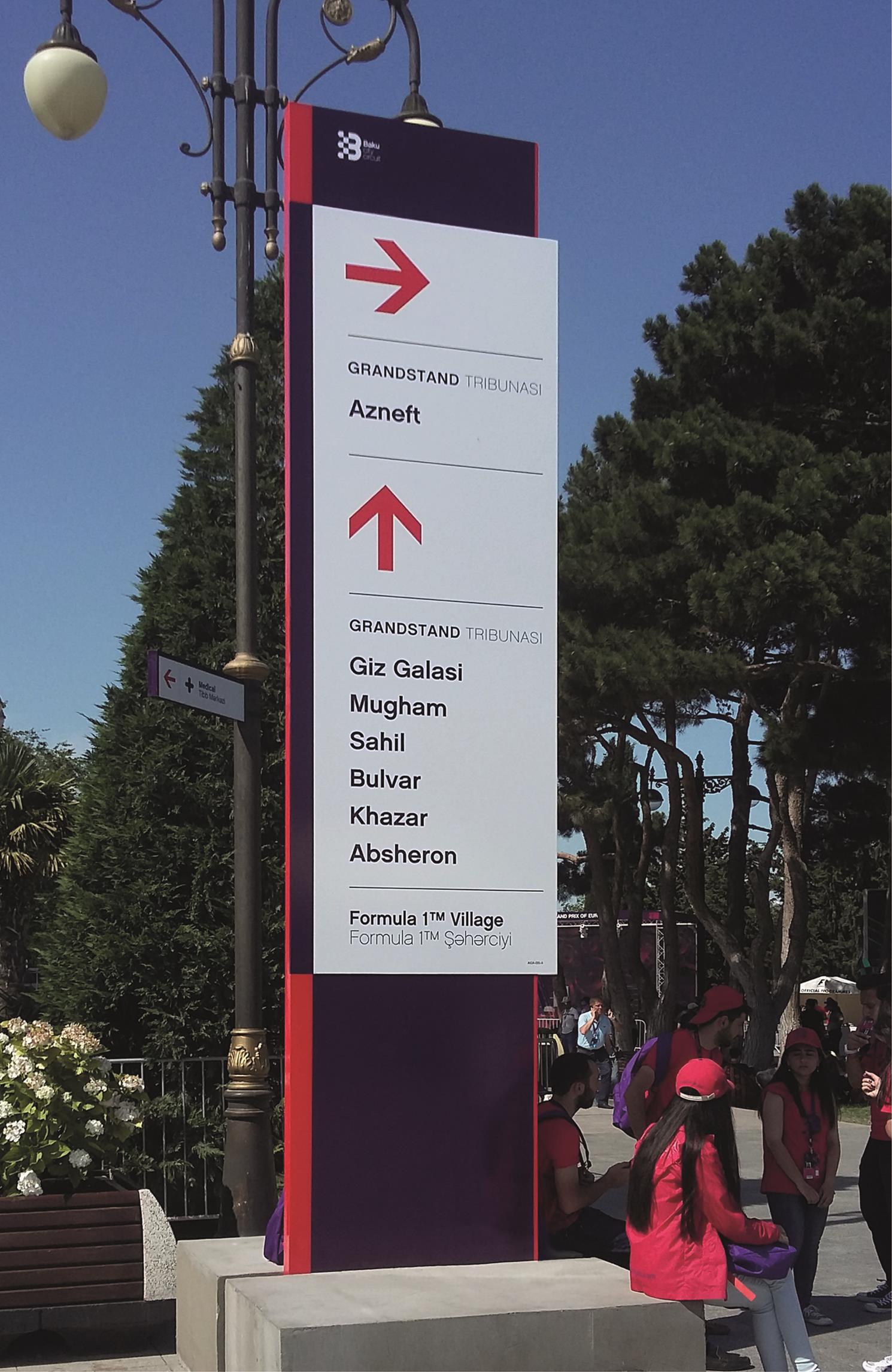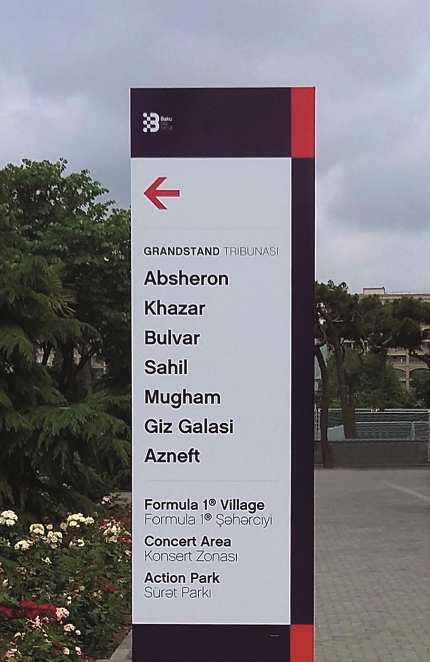 In terms of design, the constraints were not simple: the signs had to be large format to facilitate reading in large outdoor spaces and at the same time resistant to inclement weather (Baku is known as the city of wind), they had to be assembled and disassembled in a week and then stored until the following year.