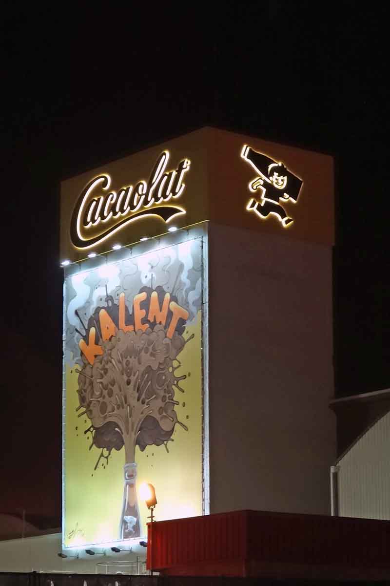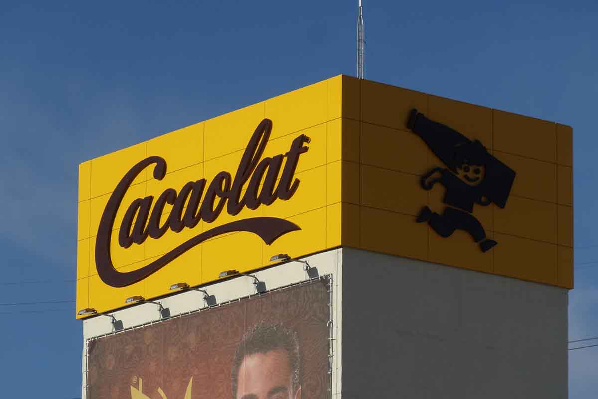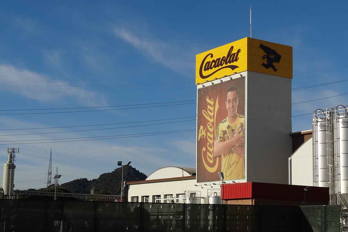 In Santa Coloma de Gramenet -Barcelona-, Cacaolat made a major investment to update its factory; accesses, buildings, loading and unloading areas were modernized. The factory’s tallest silo, which faces the entrance to the city, became an extraordinary and enormous advertising medium.