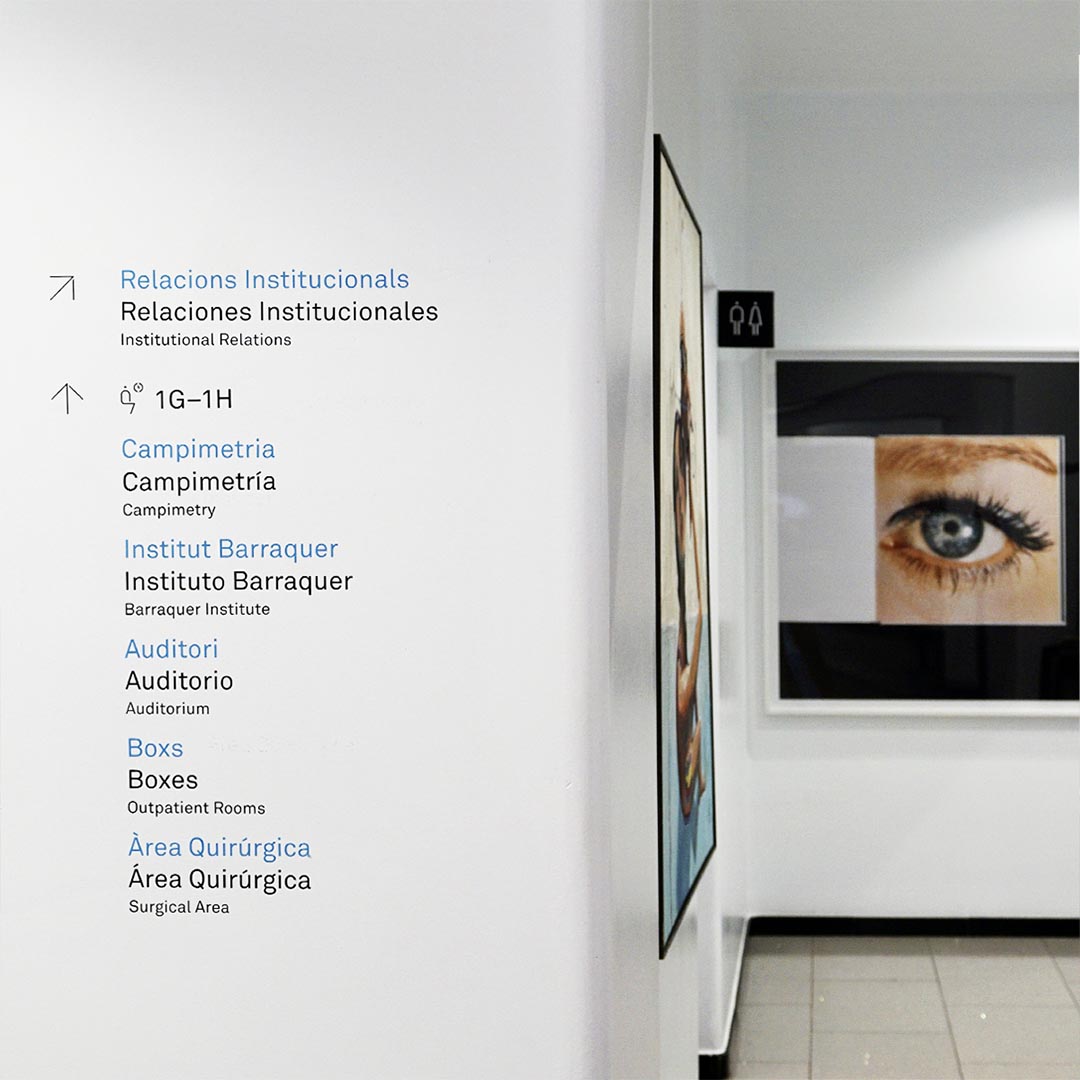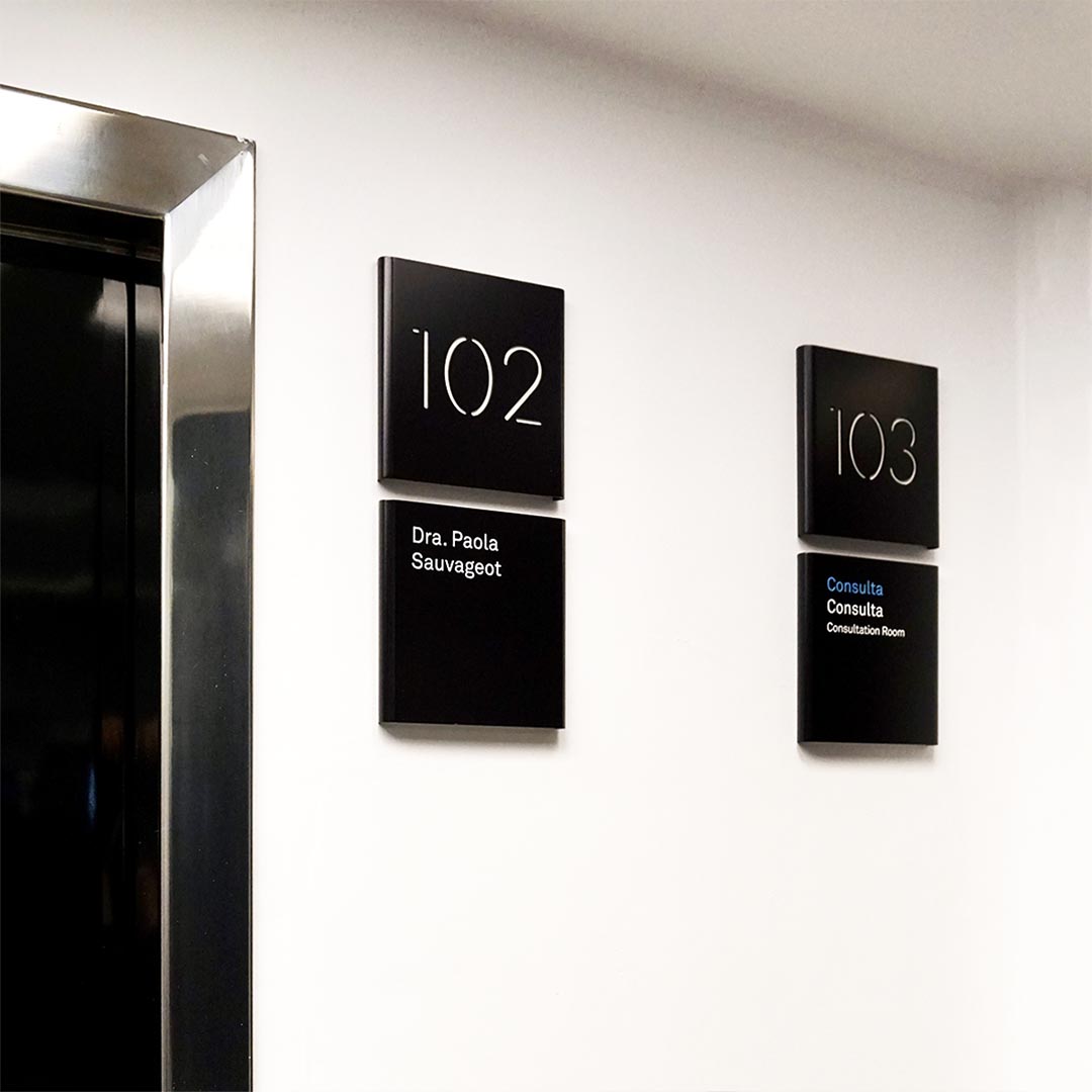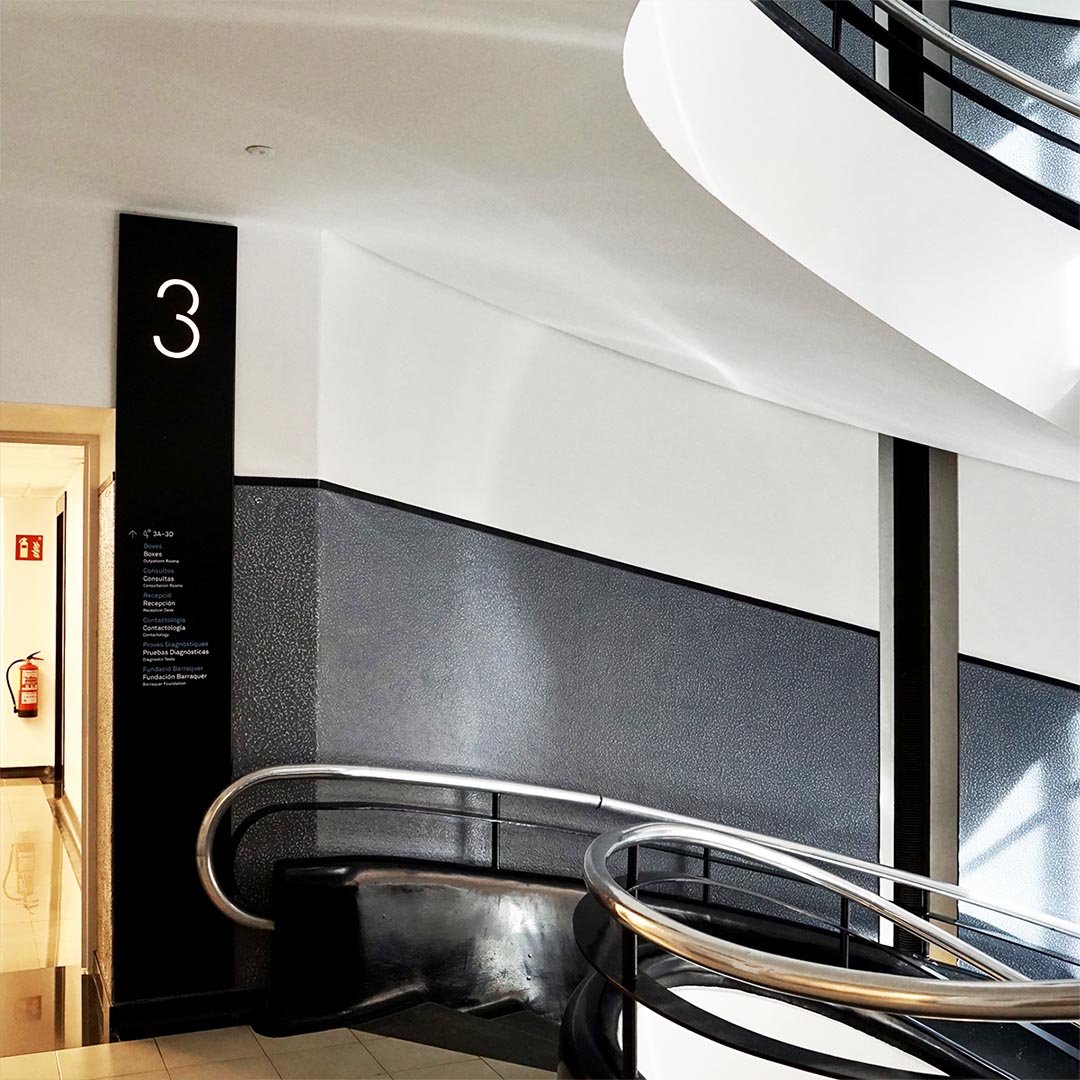 De la mano del diseño de AraunaStudio fabricamos e instalamos la señalización interior reordenando las circulaciones. Un diseño que encaja y convive, jugando con la singular arquitectura con remates curvos en sus laterales y presentada sobre el omnipresente blanco y negro que distingue el espacio.