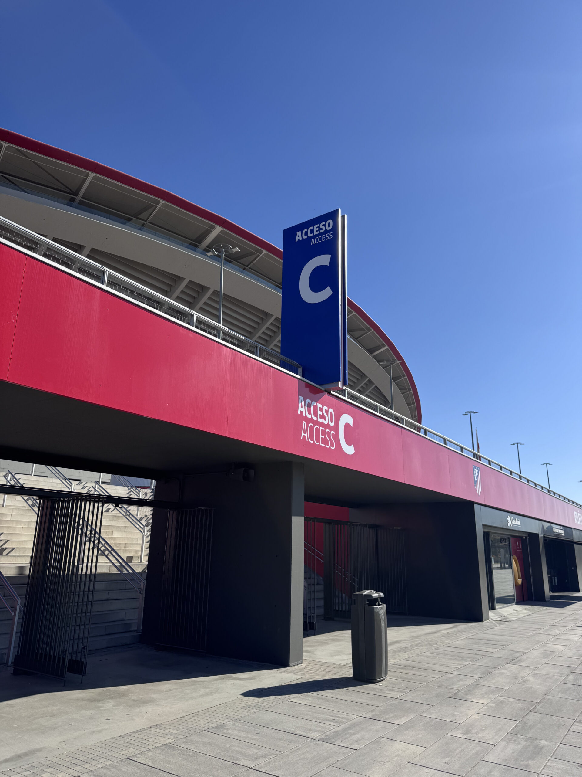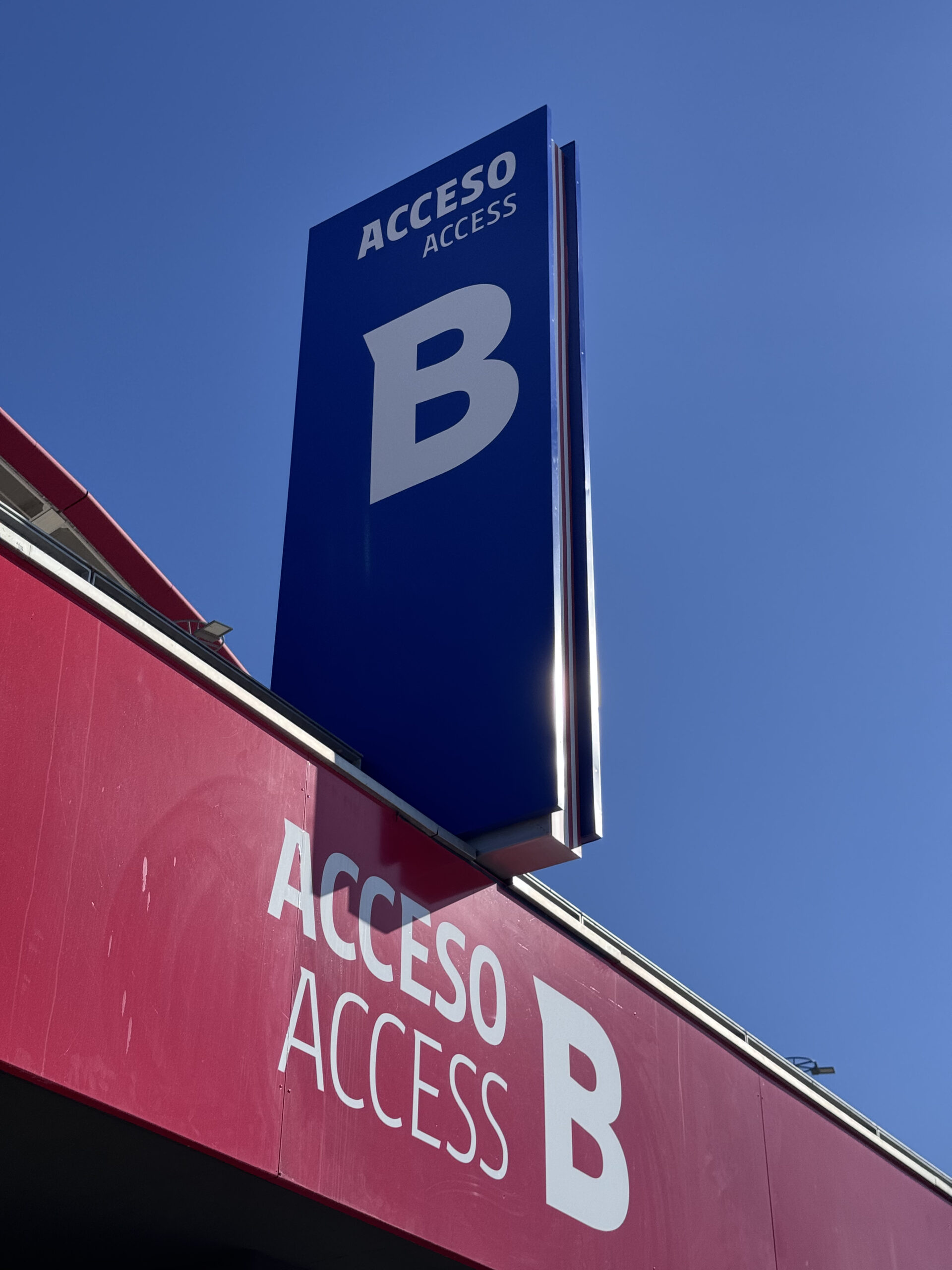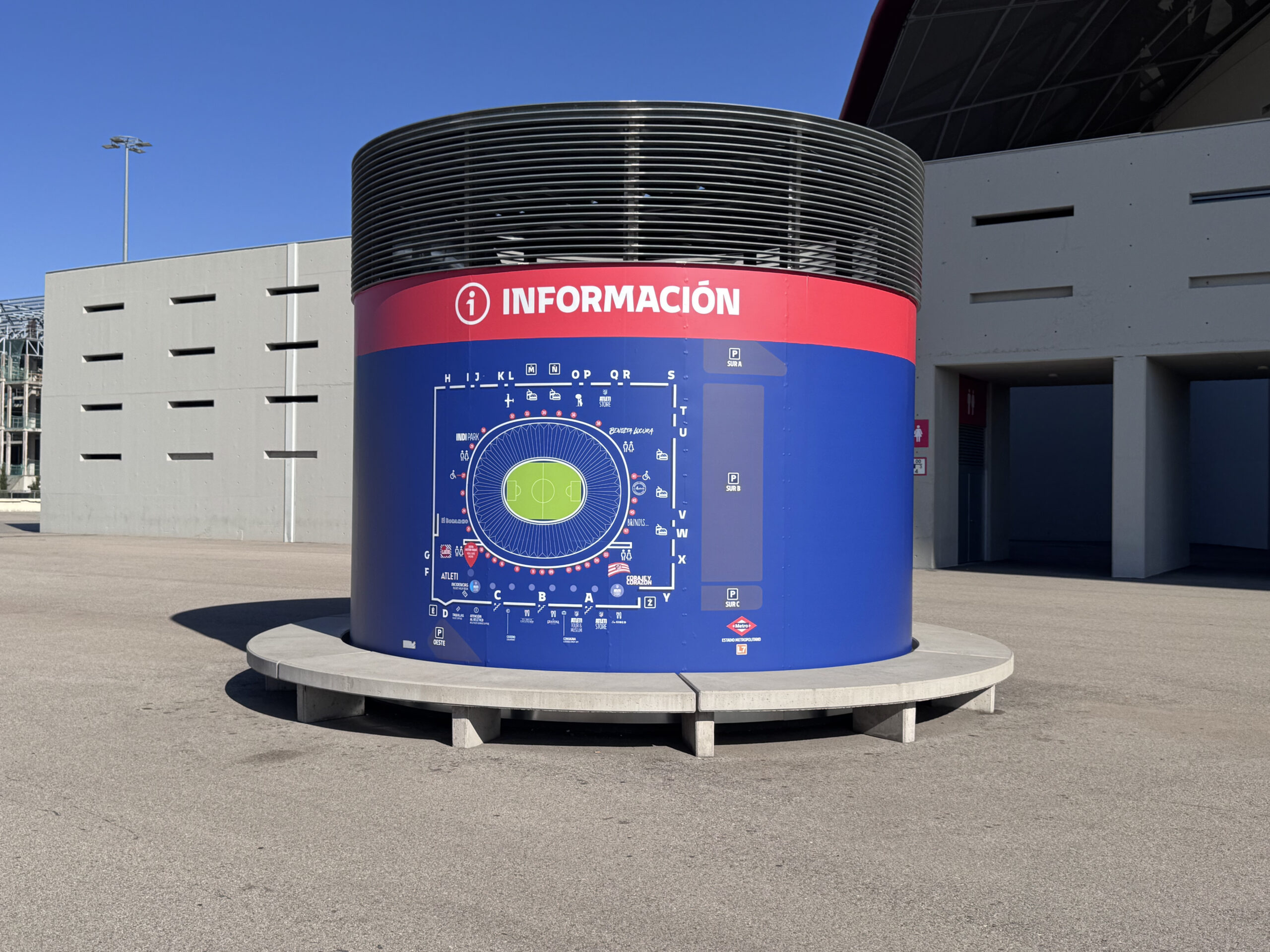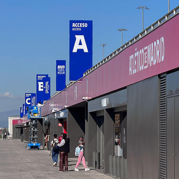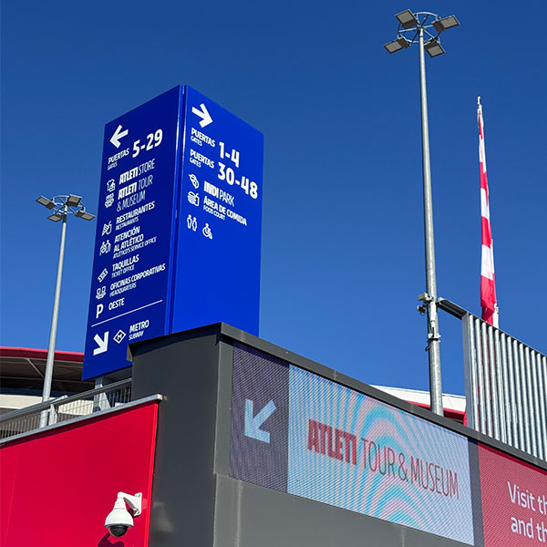 En el estadio del Atlético de Madrid, la señalización y el wayfinding se conciben como una extensión natural de la identidad del club, donde la arquitectura, el color y la gráfica trabajan de forma conjunta para orientar y emocionar al visitante. El uso predominante del rojo y el azul corporativos, junto con elementos de gran escala y alta visibilidad, refuerza el carácter del espacio y facilita la lectura intuitiva de accesos, recorridos y zonas clave. Las torres y pórticos exteriores actúan como hitos reconocibles desde la distancia, mientras que la rotulación integrada en fachadas y estructuras guía al público de forma clara y ordenada desde su llegada al recinto.