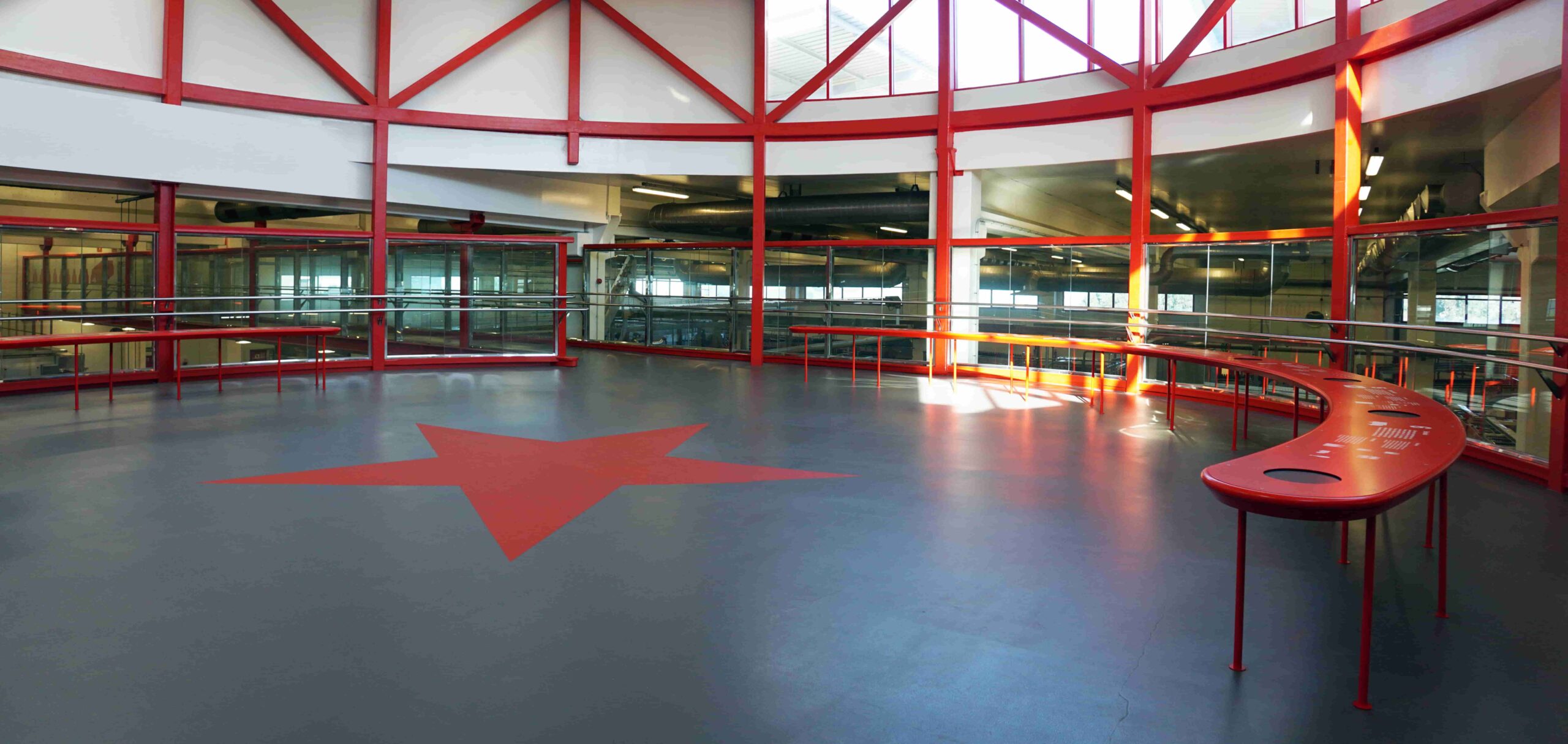 La aplicación de la mayoría de los gráficos se realizó en vinilo aplicado directamente sobre paredes o pavimentos: un único material en un único color, el rojo corporativo de la marca. Una gráfica impactante con aplicaciones simples. No necesita de más adornos.