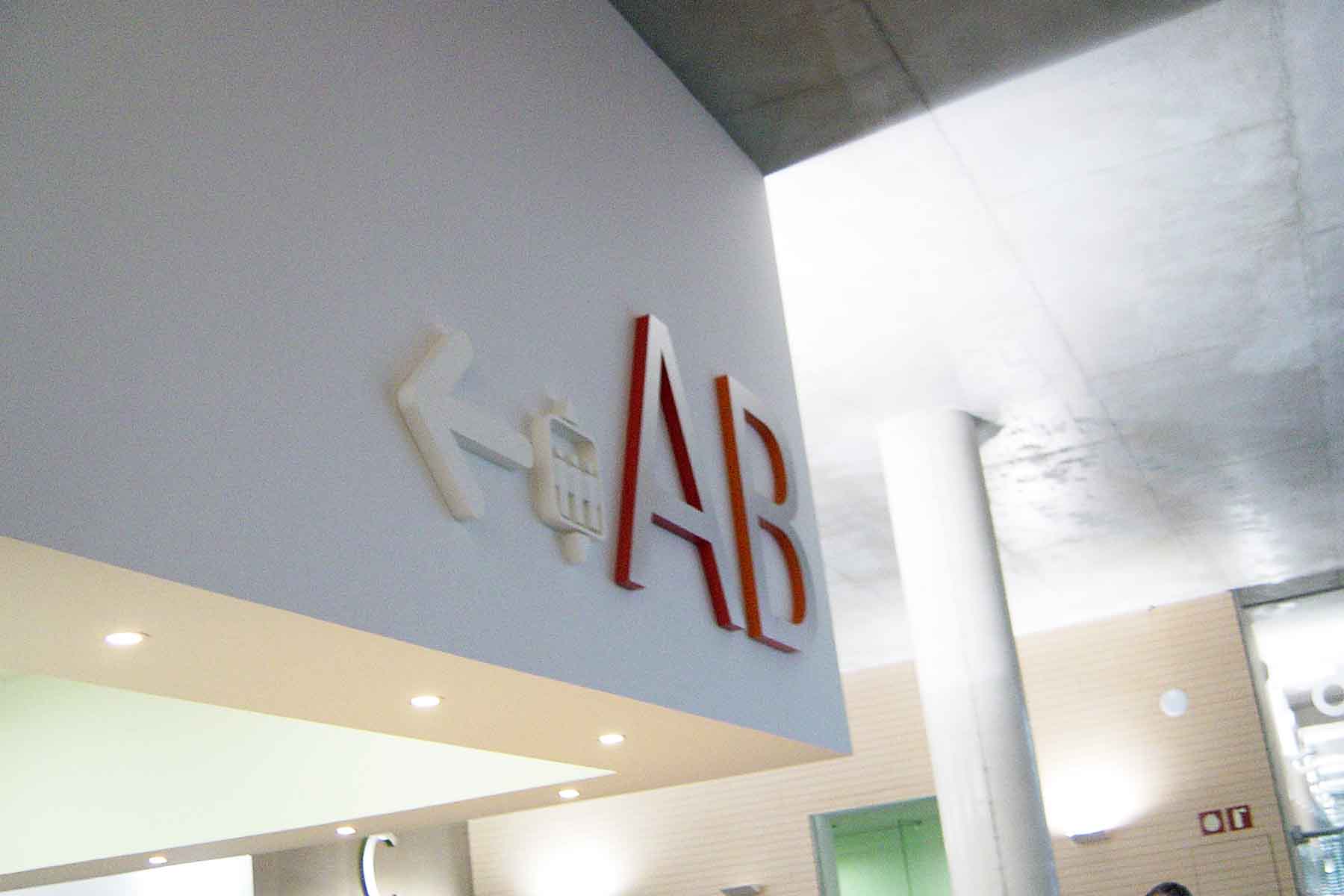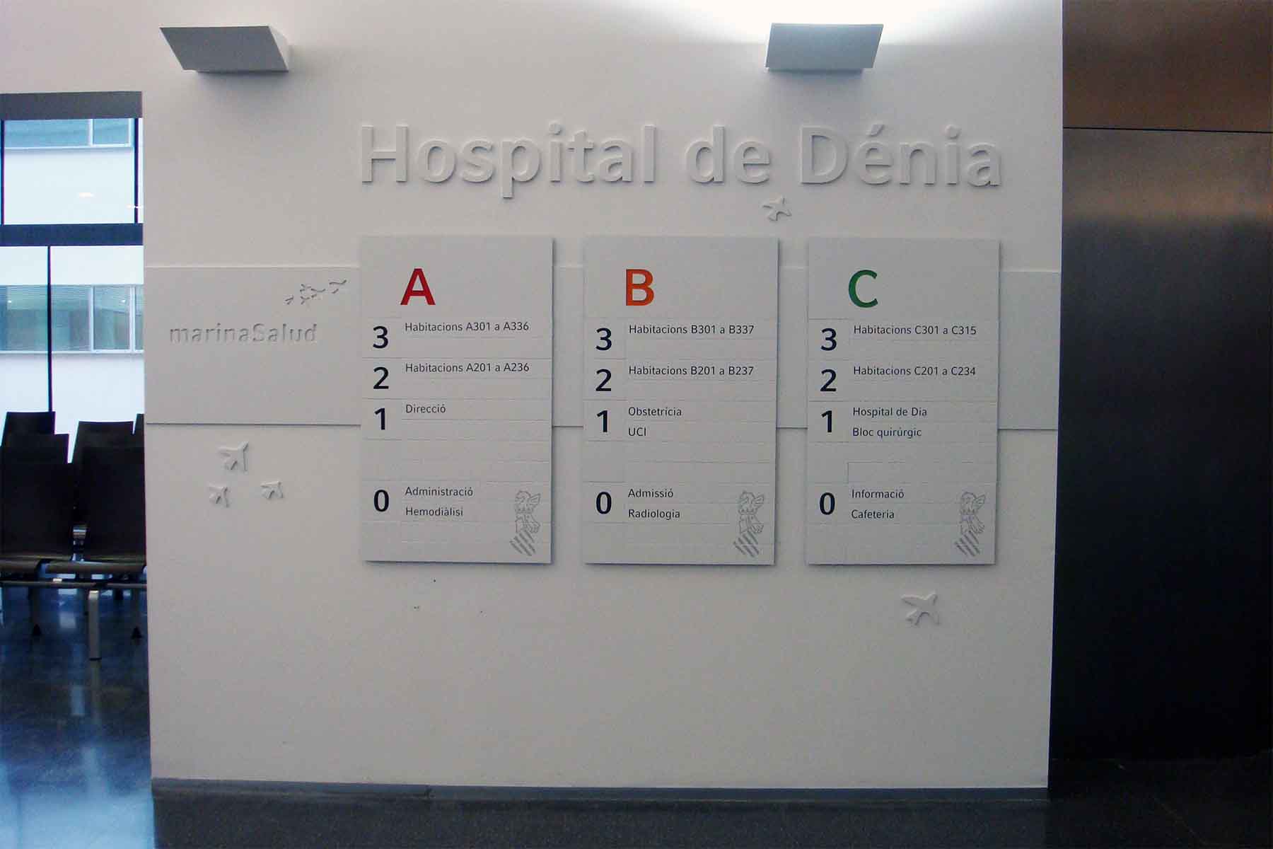 El proyecto de señalización del hospital se desarrolló en nuestro departamento de wayfinding a partir de la imagen corporativa de Marina Salud, utilizando los recursos gráficos y cromáticos de la marca. Se diseñó una familia de rótulos para resolver todas las necesidades de señalización; tótems exteriores para la localización de los diferentes accesos y entradas del hospital, señalización peatonal, rótulos identificativos e informativos, directorios generales y de planta, así como rótulos direccionales, pictogramas y rótulos posicionales de despachos y consultas.