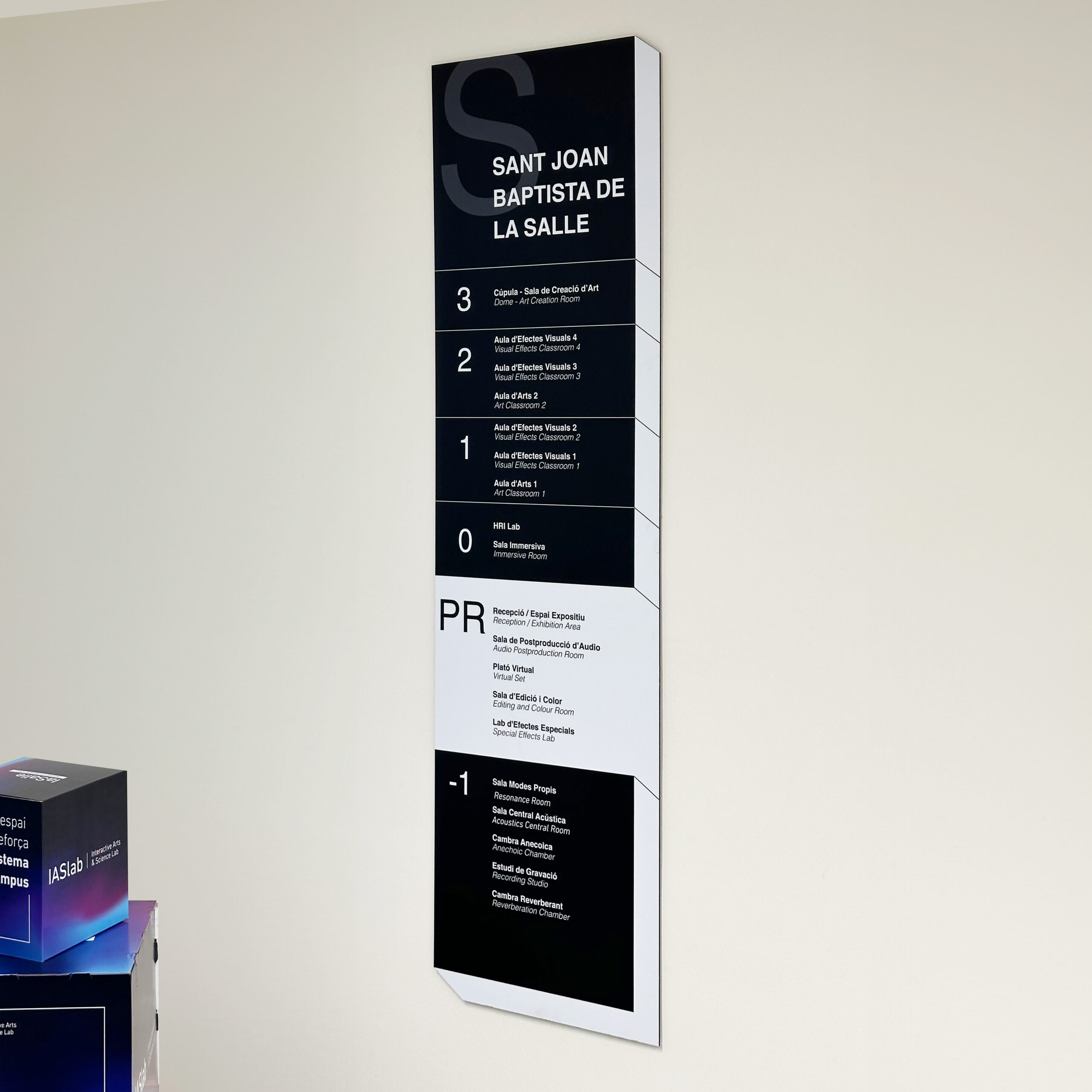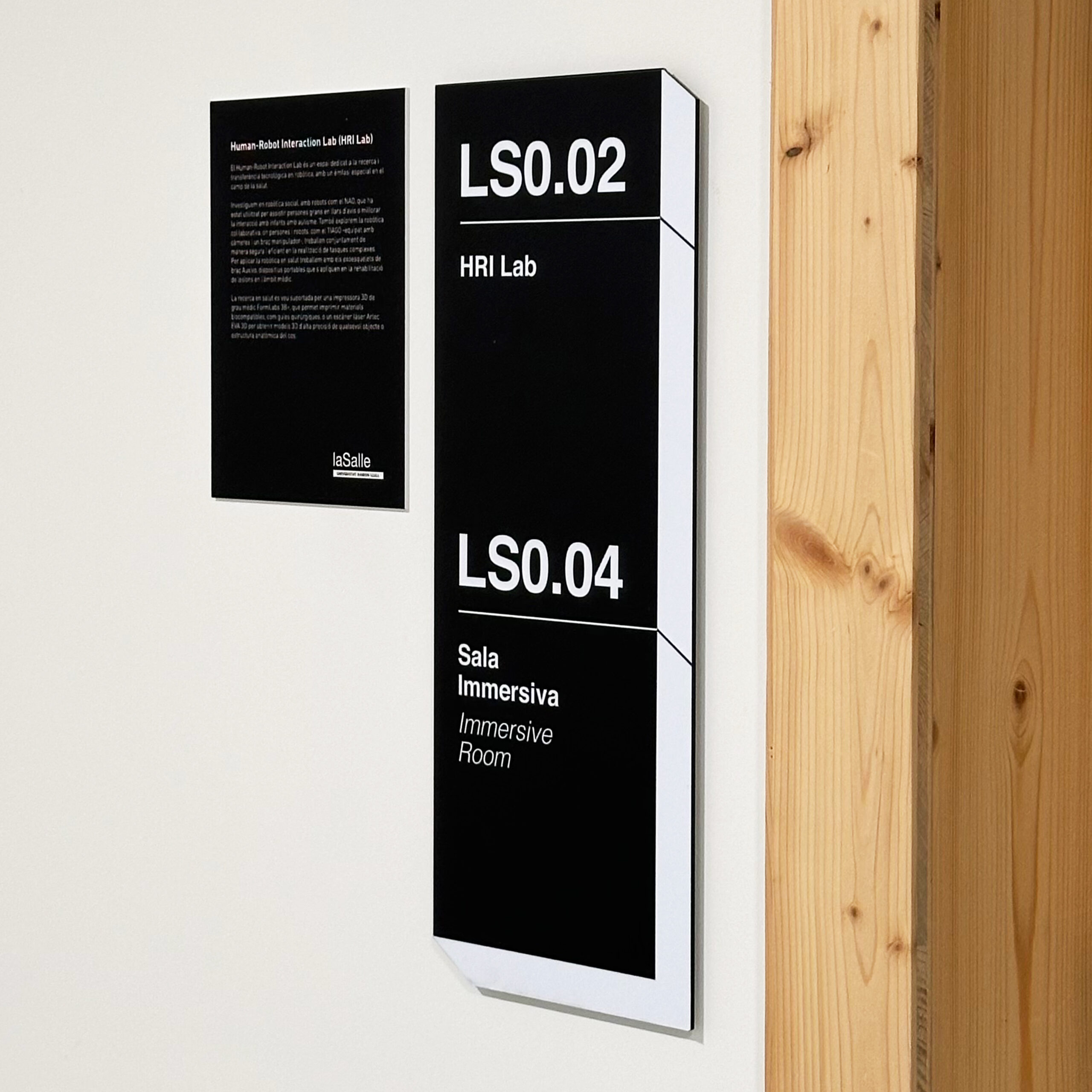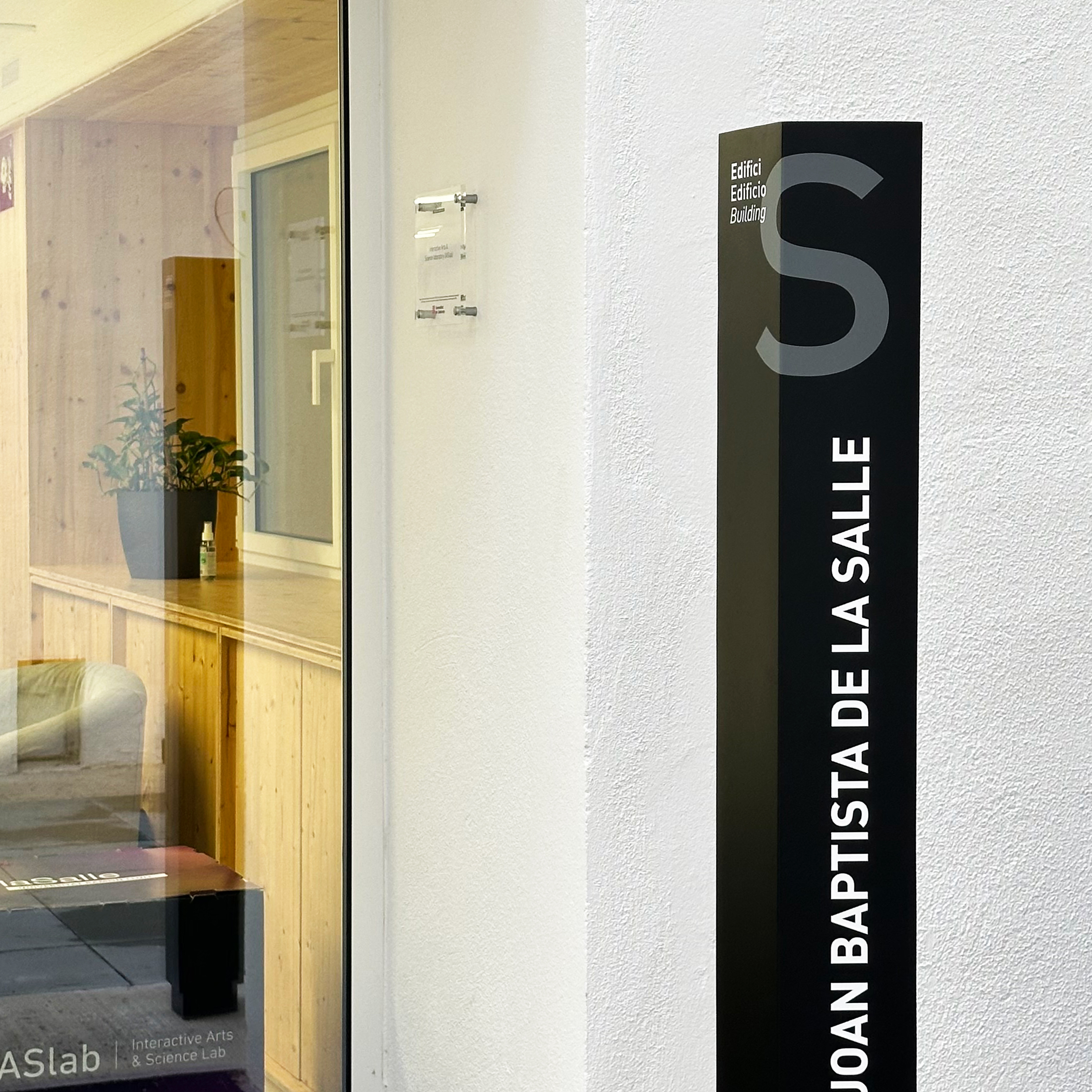 IASlab (Interactive Arts & Science Laboratory) es un espacio de investigación avanzada dentro de La Salle Campus Barcelona que requiere un sistema de señalización adaptado a su carácter tecnológico y experimental. El proyecto abarca la señalización interior y exterior del edificio, combinando precisión, funcionalidad y una estética contemporánea alineada con su actividad innovadora.