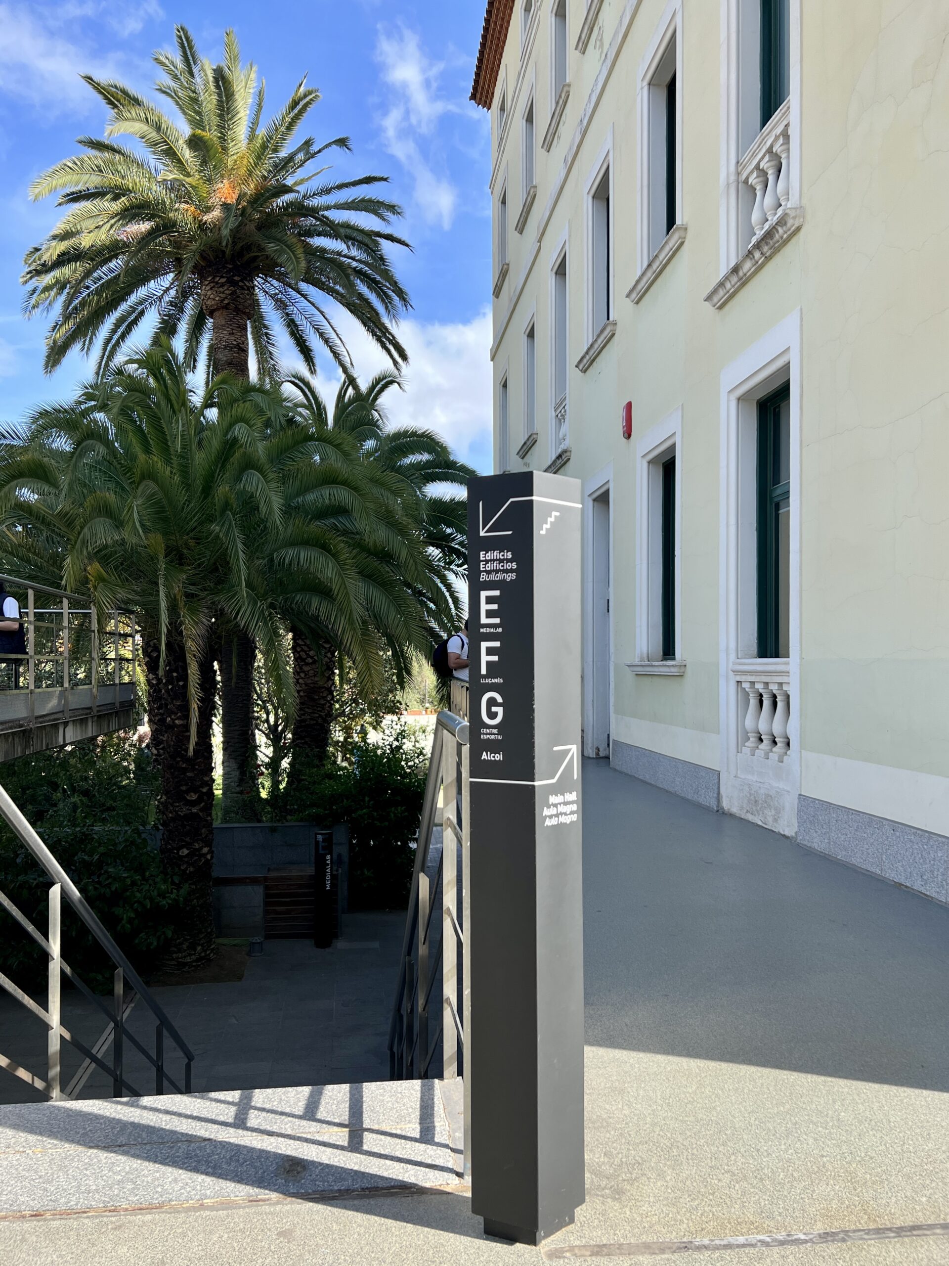 La señalización, integrada con la arquitectura y el paisaje, combina sobriedad formal, legibilidad tipográfica y coherencia gráfica para guiar a estudiantes, profesorado y visitantes de forma intuitiva. El sistema refuerza la identidad del campus y optimiza los flujos de circulación, aportando claridad, orden y una experiencia de usuario más fluida.